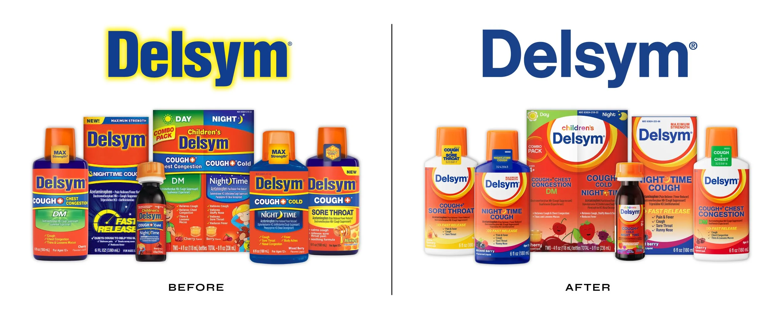 Delsym® revolutionized cough medicine in the 1980s by pioneering the first 12-hour cough suppressant liquid. Its innovative delivery system, which inspired the brand name “DELivery SYsteM,” set a new standard in long-lasting cough relief. As the #1 pharmacist-recommended brand for both adult and children’s cough relief products, Delsym had long focused on maintaining a small but mighty portfolio of products, a functional, no frills brand identity, and a distinctly orange brand block for easy shelf navigation. However, as the category evolved (both with product innovation and packaging design), Delsym found themselves falling behind– and decided to take action. Thus began the first major rebrand in Delsym’s history.